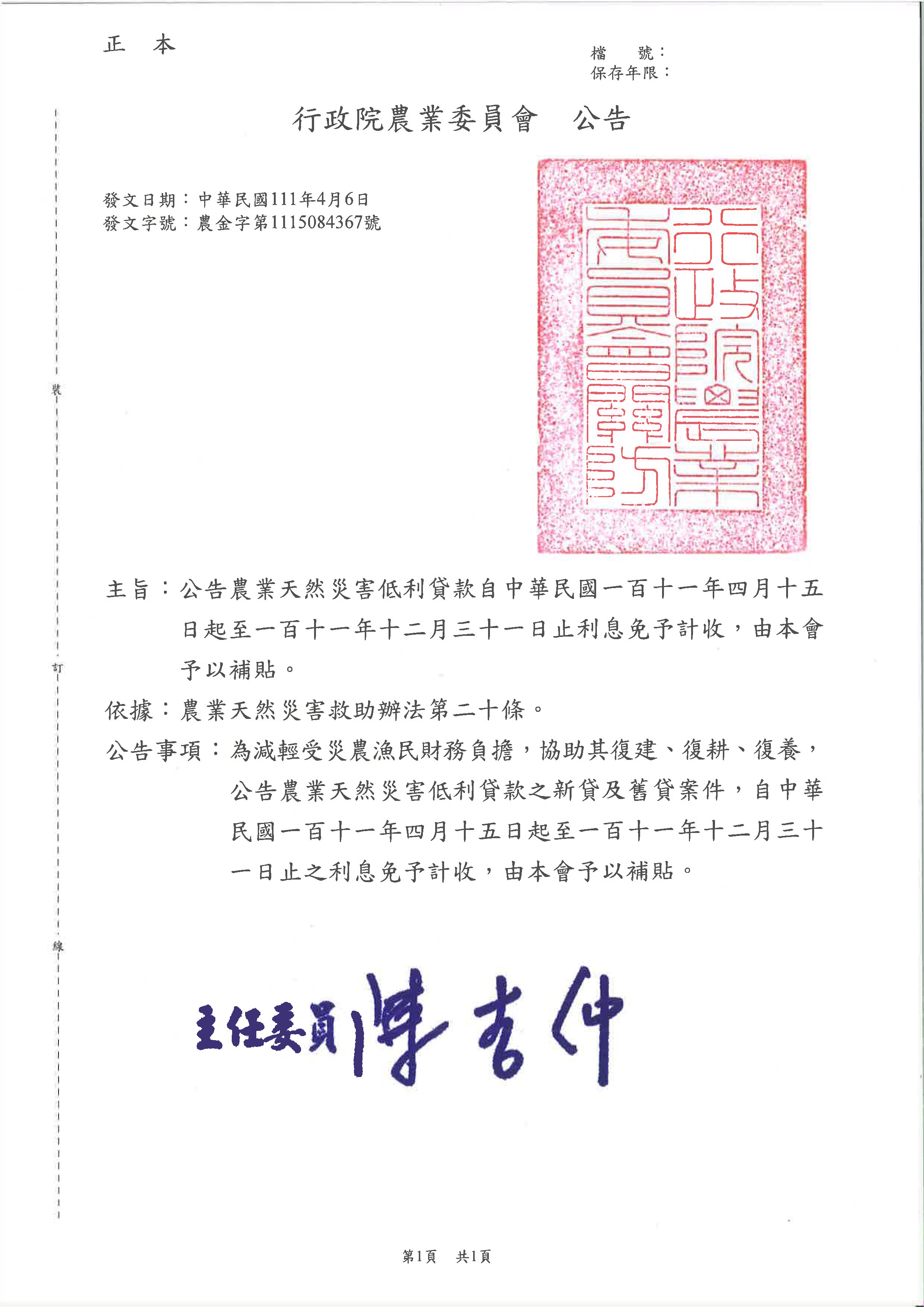 公告農業天然災害低利貸款之新貸及舊貸案件,