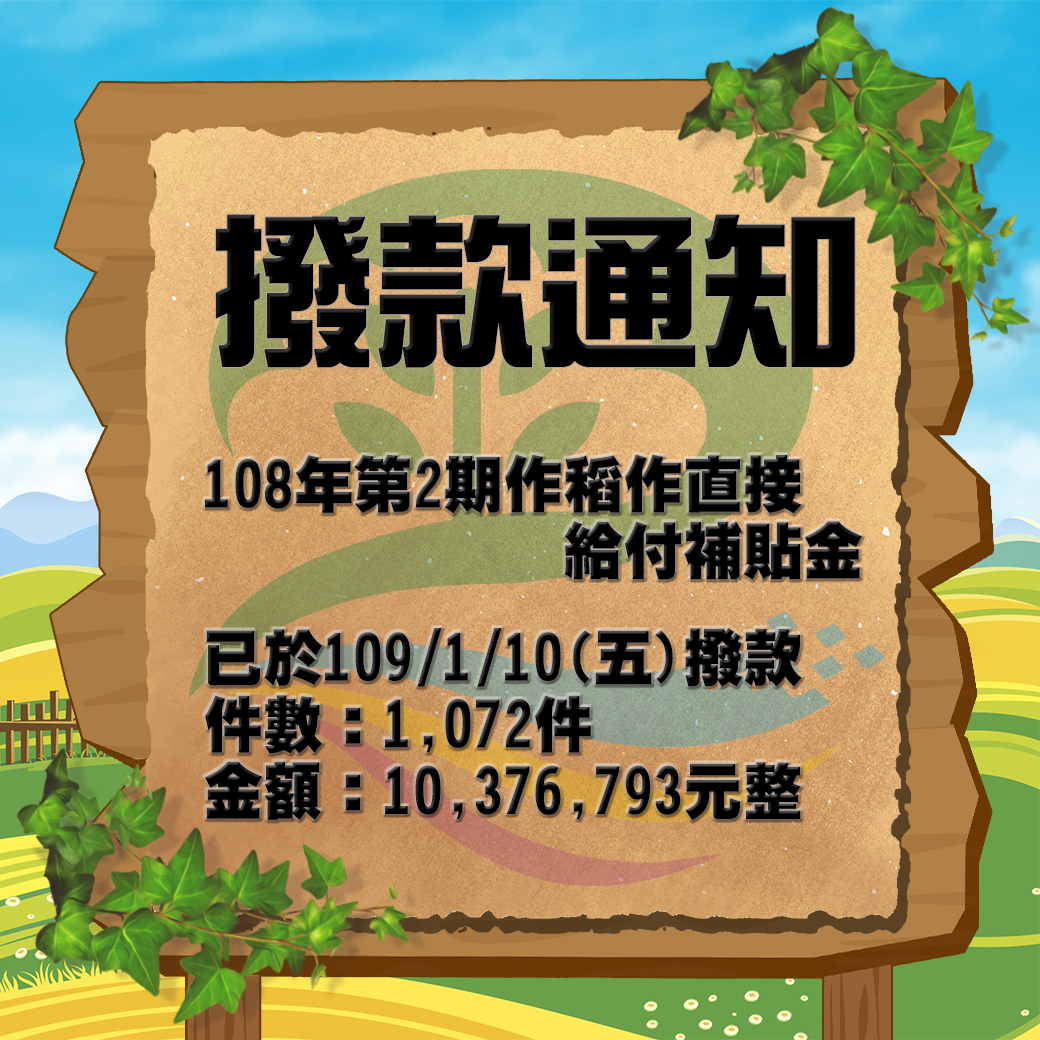 108年第2期作稻作直接給付補貼金已於109/1/10(五)撥款囉!!
