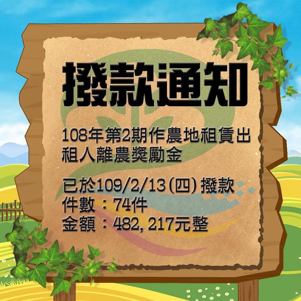 108年第2期作稻作直接給付優質稻米獎勵金已於109/2/5(三)撥款囉!!