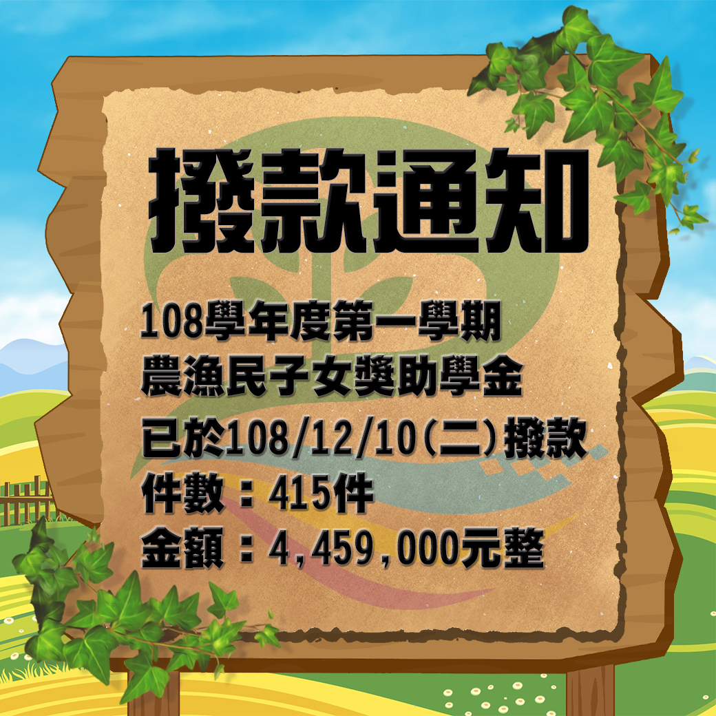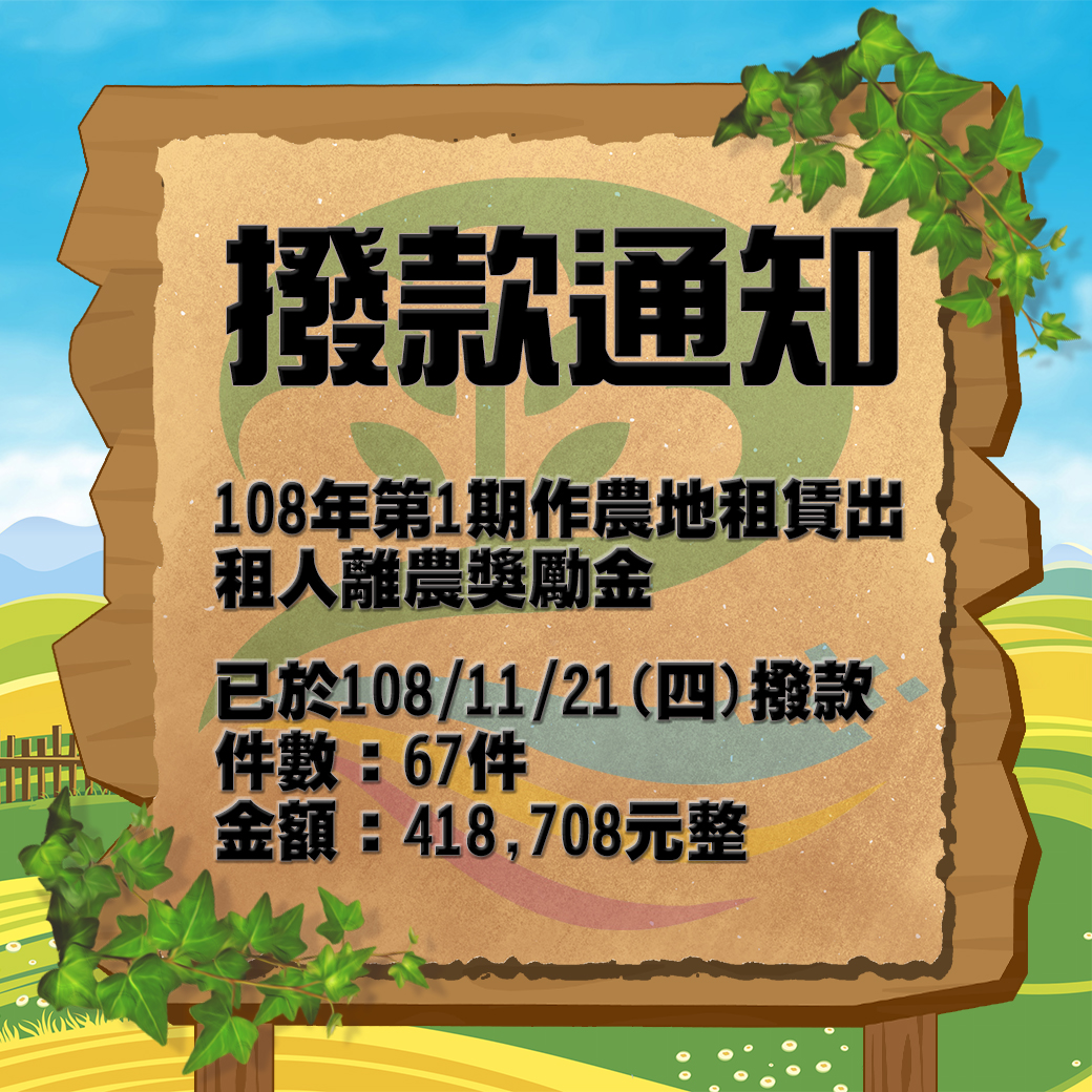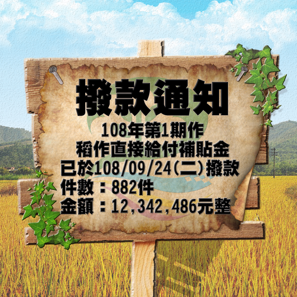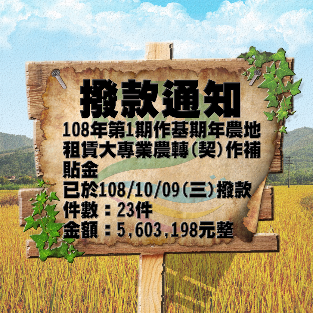 108年第1期作基期年農地租賃大專業農轉(契)作補貼金已經撥款囉!