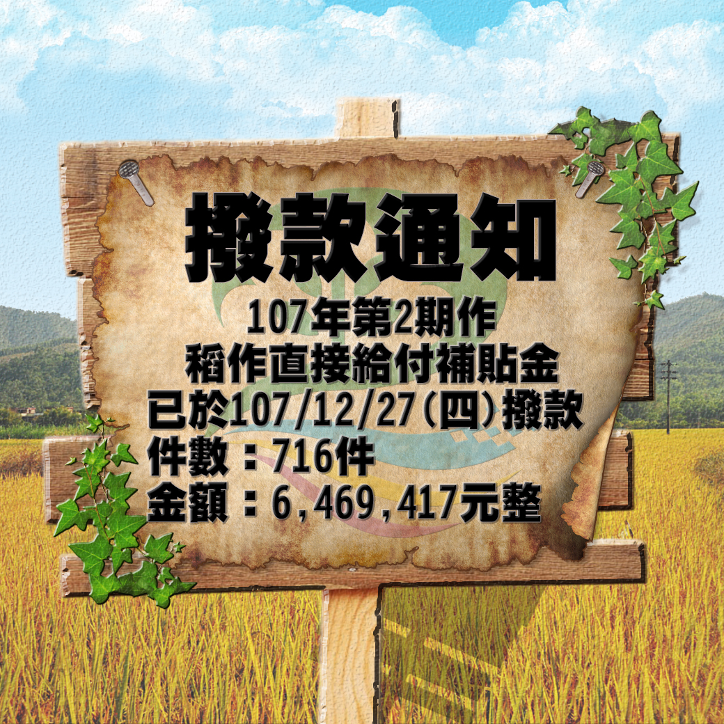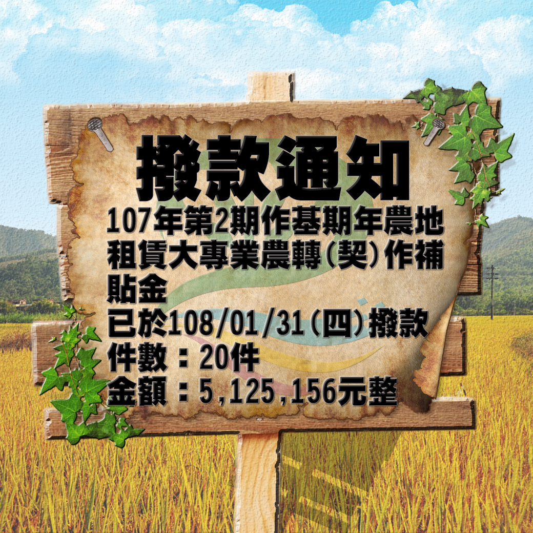 107年第2期作基期年農地租賃大專業農轉(契)作補貼金已經撥款囉!