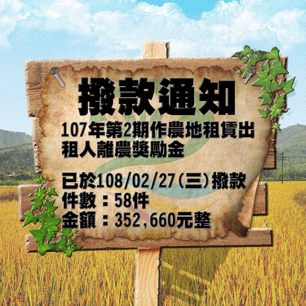 107年第2期作農地租賃出租人離農獎勵金已經撥款囉!