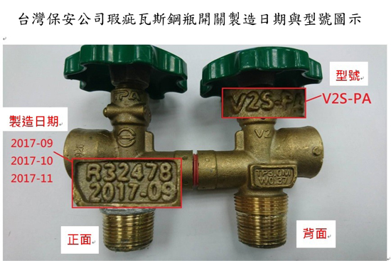 製造日期在2017.09-11月份等3批且型號為V2S-PA之瓦斯瓶開關,