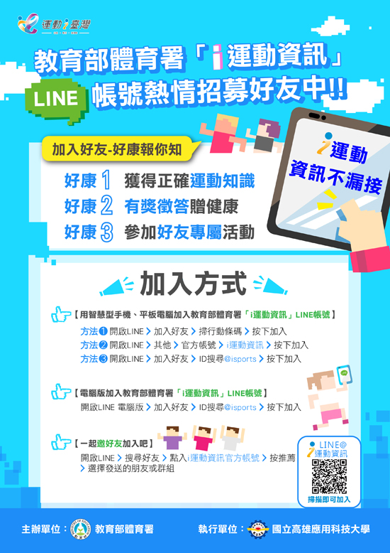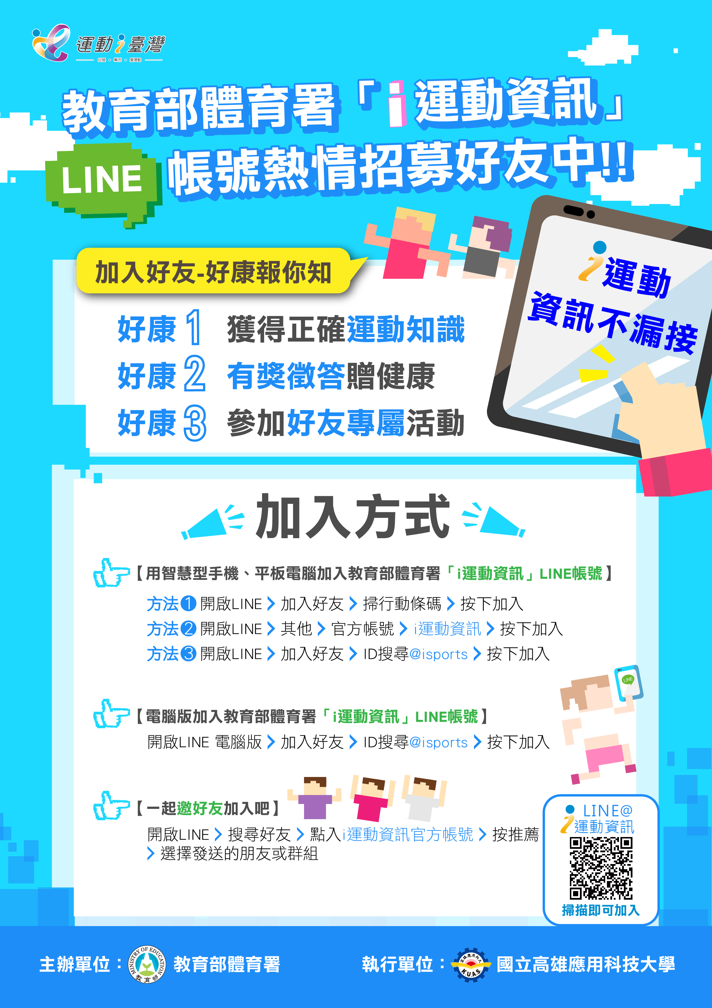 轉發【彰化縣政府】訊息公告:為提升規律運動人口質量,並協助國人獲取正確運動知能,教育部體育署「i運動資訊」LINE帳號熱情招募好友中!!