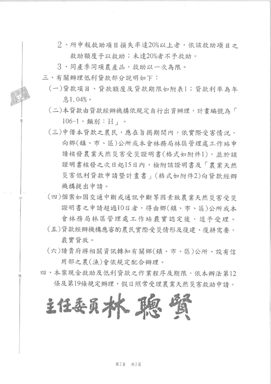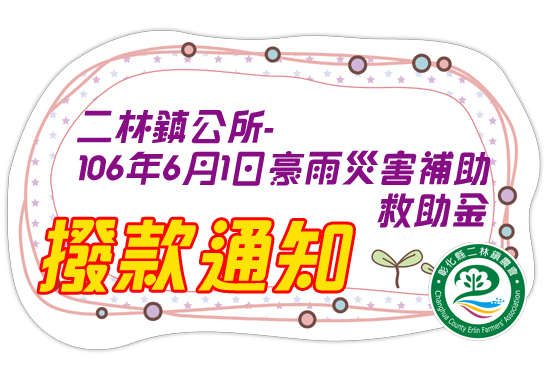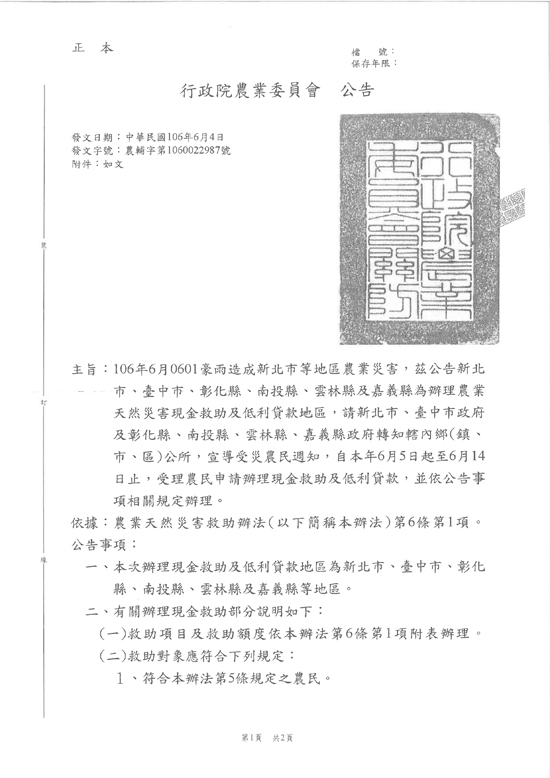 公告~因106年6月豪雨造成新北市、台中市、彰化縣、南投縣、雲林縣及嘉義縣等地區農業災害,自106/6/5~106/6/14日止,受理農民申請辦理救助及低利貸款。 其相關詳情,歡迎洽詢本會信用部/放款組 電話:04-8961191分機207-209
