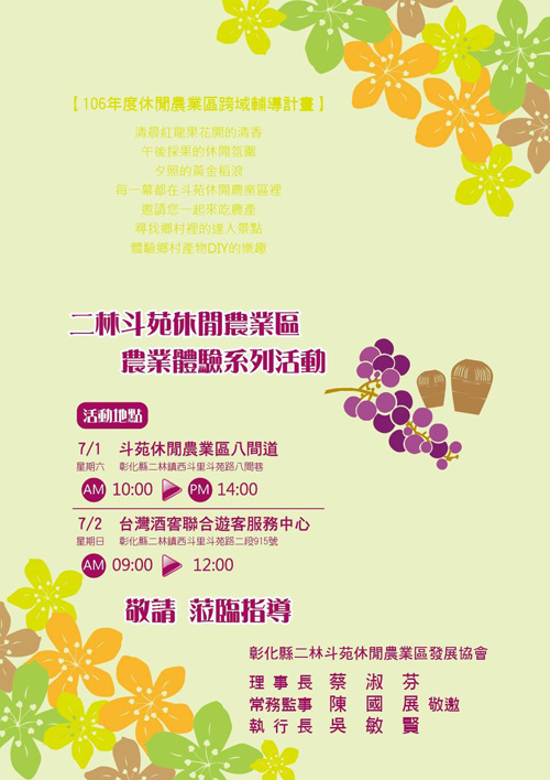 誠摯的邀請您!!! 7/1、7/2一同來參與斗苑休閒農業區的農村體驗系列活動~