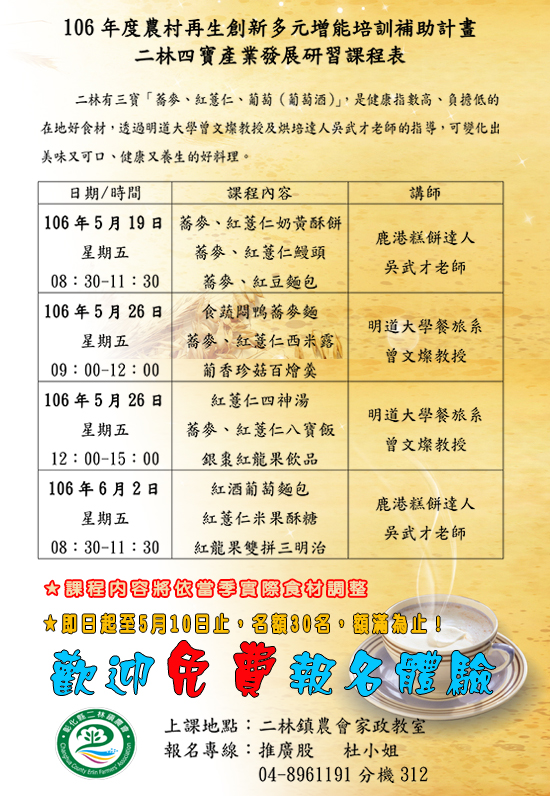 報名期限:即日起至106/8/25止,每班名額有限,想參加者手腳可要快!!!