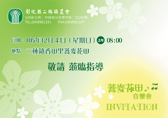 敬邀~2016二林蕎麥花田音樂會~邀您一同聽音樂.賞花.漫遊蕎麥花海,歡迎各位民眾踴躍參與!
