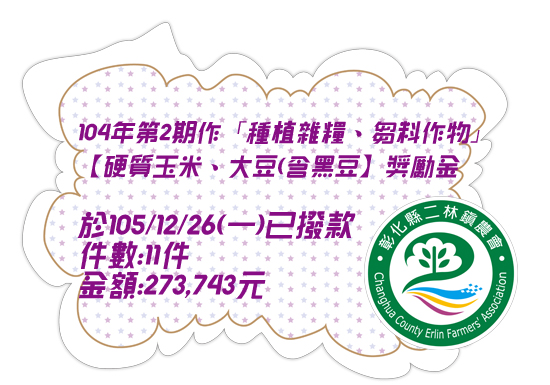 104年第2期作「種植雜糧、芻料作物獎勵金」撥款通知~