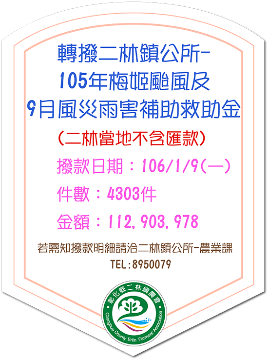轉撥二林鎮公所-105年梅姬颱風及9月風災雨害補助救助金