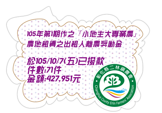 105年第1期作之「小地主大專業農」農地租賃之出租人離農獎勵金撥款通知~