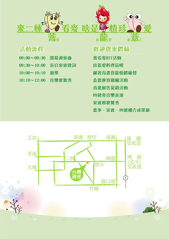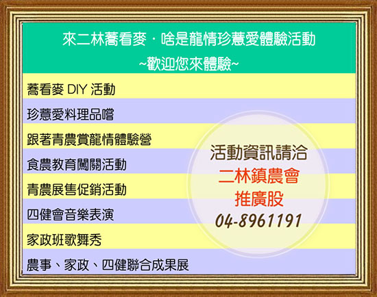 謹訂於105年10月23日(星期日)上午9點, 於本會台灣酒窖舉辦~ 『來二林蕎看麥.啥是龍情珍薏愛』活動 竭誠歡迎各界長官及貴賓蒞臨指導。 活動內容如下: