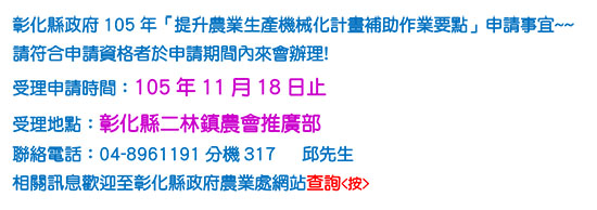 彰化縣政府105年「提升農業生產機械化計畫補助作業要點」申請事宜 |