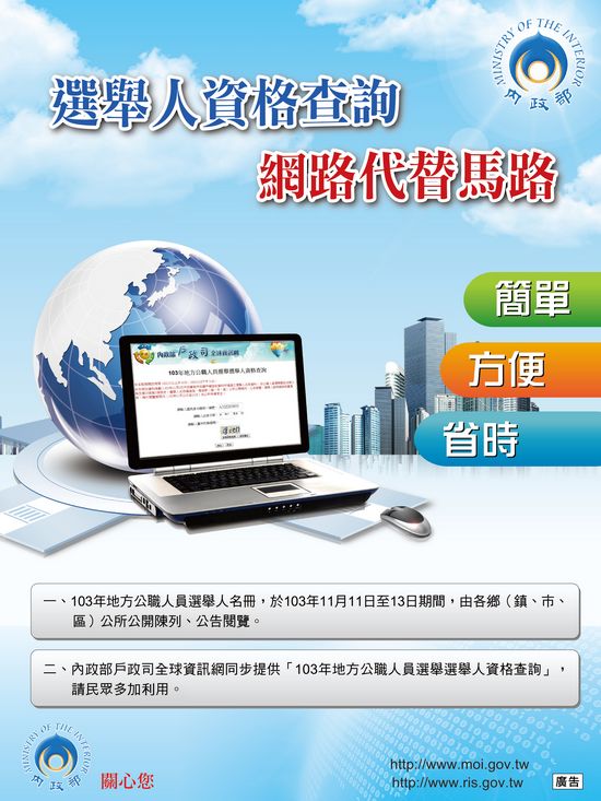 今年為便利民眾查詢,內政部在選舉人名冊公告陳列的期間,也特別在內政部戶政司全球資訊網http://www.ris.gov.tw建置「103年地方公職人員選舉選舉人資格查詢」系統,歡迎選舉人多加使用查詢,以保障權益。