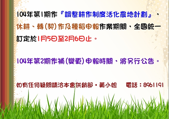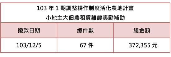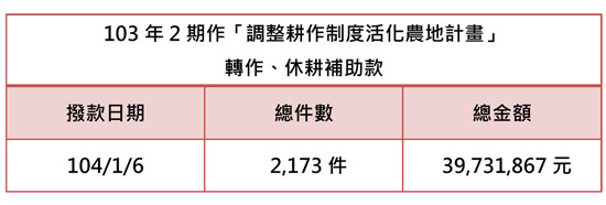 103年2期作「調整耕作制度活化農地計畫」轉作、休耕補助已完成撥款~