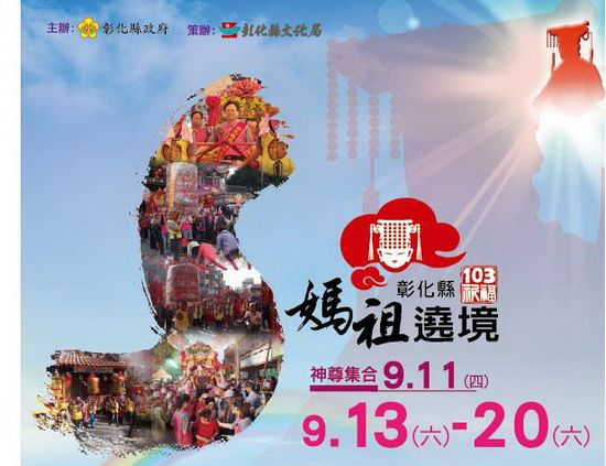 彰化縣媽祖聯合遶境祈福活動9/11~20來彰化拜媽祖求平安,還有廟埕遊藝趣及豐富奬品等您來挑戰,詳情請上縣府網站查詢。