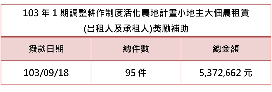 103年1期作「調整耕作制度活化農地計畫小地主大佃農」租賃獎勵金已完成撥款~