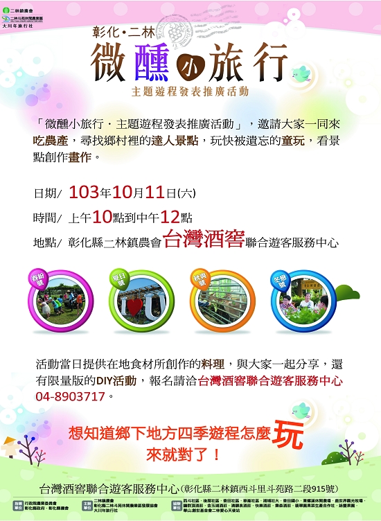 謹訂於中華民國103年10月25日(星期六)上午十點, 於二林鎮農會台灣酒窖聯合遊客服務中心舉辦 :