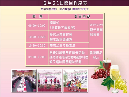 謹訂於6月21日(六)上午9:00在台灣酒窖舉辦 103年度樂在二林-葡萄產業文化系列活動 竭誠歡迎民眾踴躍參與!