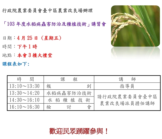 本會謹訂於103年5月9日(星期五)於本會三樓會議室辦理「稻草再利用應用腐化菌分解之宣導說明會」,敬請轄內民眾踴躍參加!!