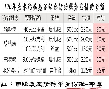 本會自即日起辦理水稻病蟲害綜合防治藥劑補助方案,補助藥劑如下: