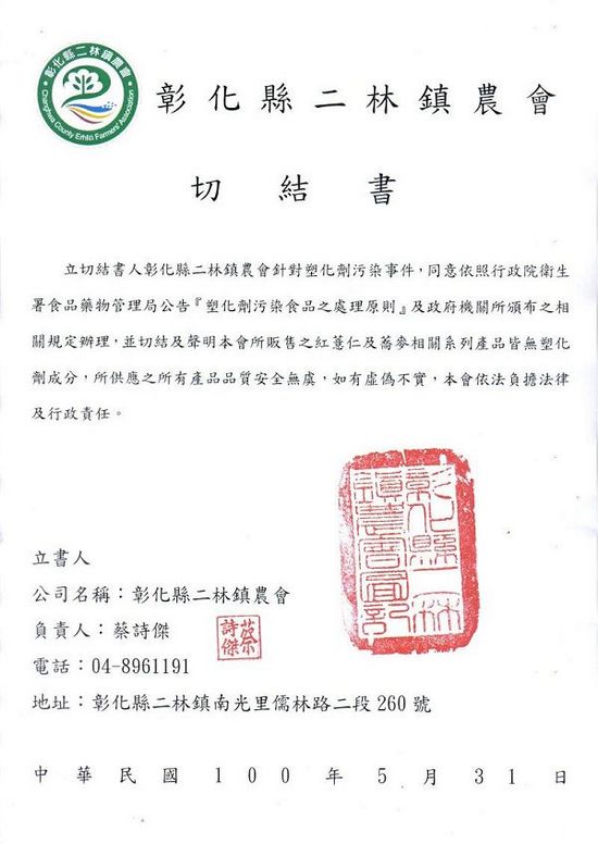 本會針對塑化劑污染事件,同意依照行政院衛生署食品藥物管理局公告「塑化劑污染食品之處理原則」及政府機關所頒布之相關規定辦理,並切結及聲明本會所販售之紅薏仁及蕎麥相關系列產品皆無塑化劑成分,所供應之所有產品品質安全無虞,如有虛偽不實,本會依法負擔法律及行政責任。