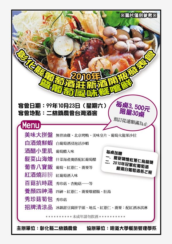 一、宴會名稱:2010年彰化縣葡萄酒莊新酒開瓶發表會暨葡萄風味餐嚐鮮