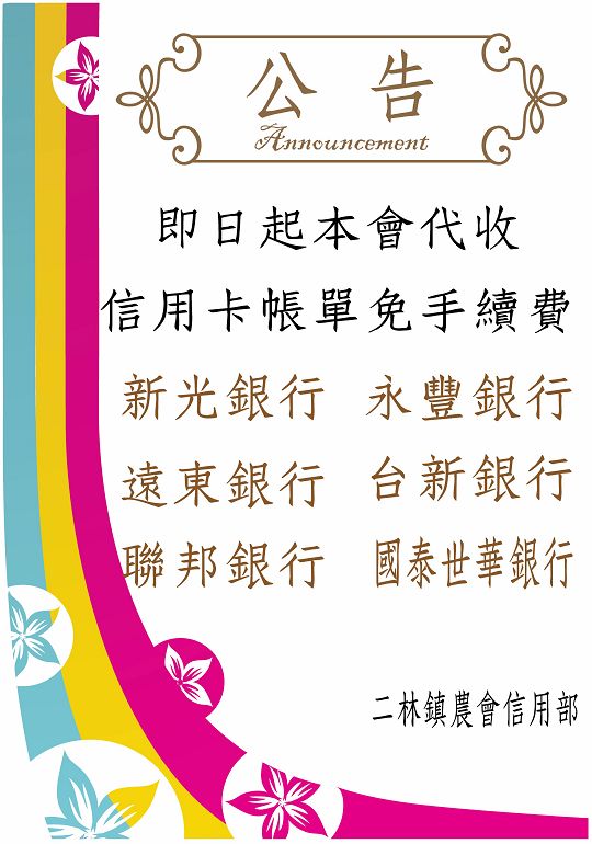 即日起本會代收台新銀行、新光銀行、永豐銀行、遠東銀行、 聯邦銀行及國泰世華銀行信用卡帳單免手續費,請多加利用, 謝謝!!