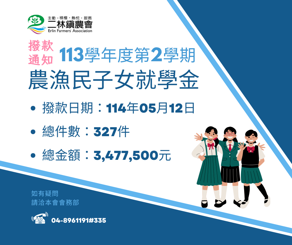 標題:113學年度第2學期農漁民子女就學金撥款通知