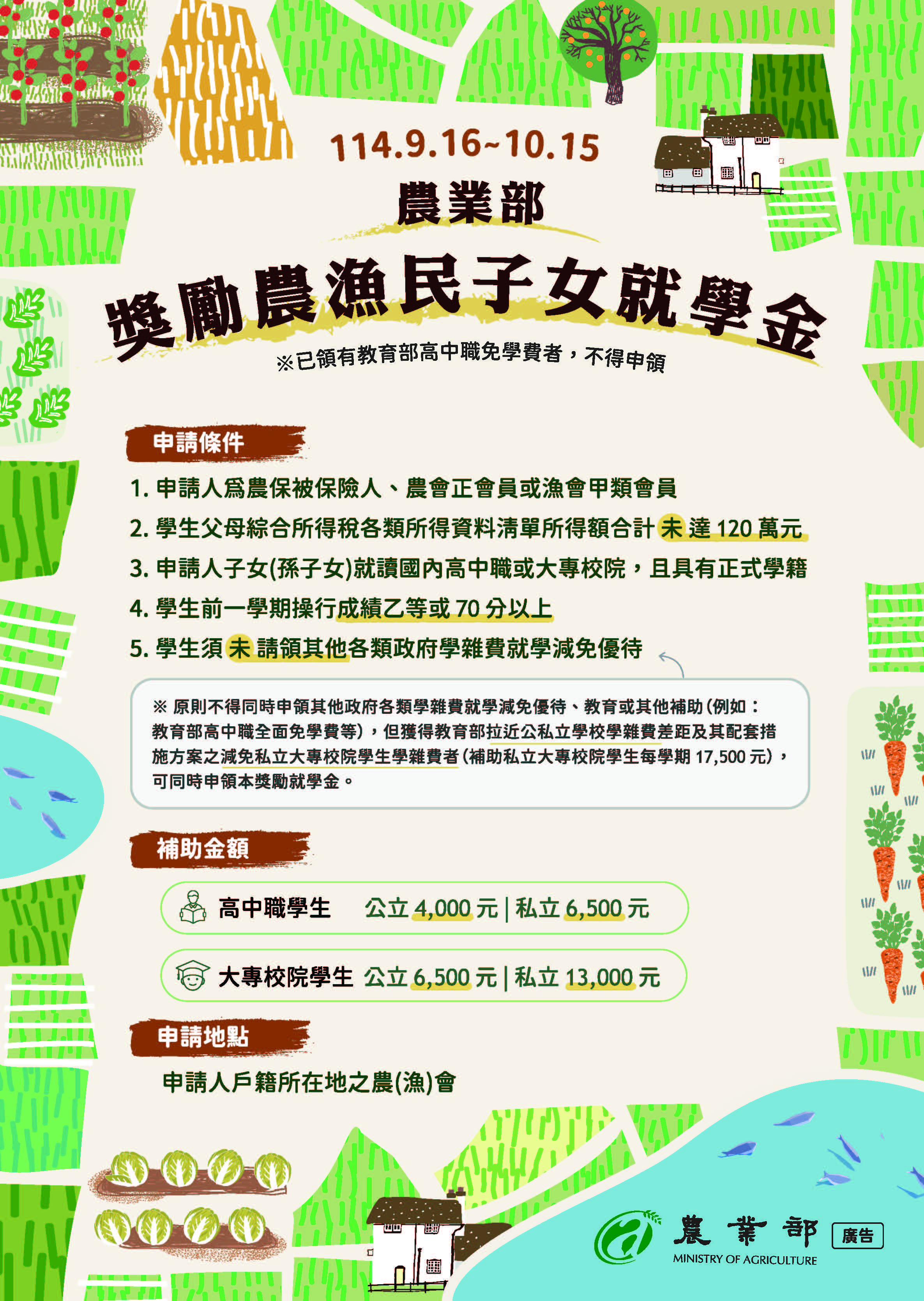 標題:農業部獎勵農漁民子女就學金【114學年度第1學期】開始申請